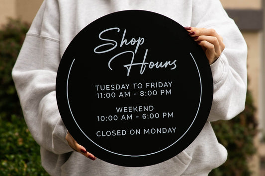 Round Acrylic Sign (Store Hours) w/ No Holes - custom signage for office home rental door, small business, spa salon operation hours signs