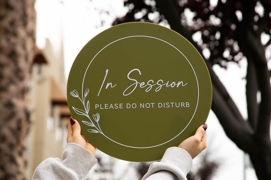Round Acrylic Sign (In Session) w/ No Holes - Custom signage for office door small business owner craft fair event gift logo trade show