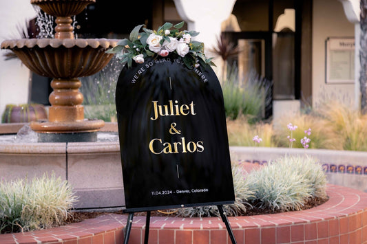 Our large custom welcome signs offer inviting and crystal-clear messaging that sets the wedding ambiance. Available in arched acrylic signs or straight styles in a palette of chic acrylic colors.