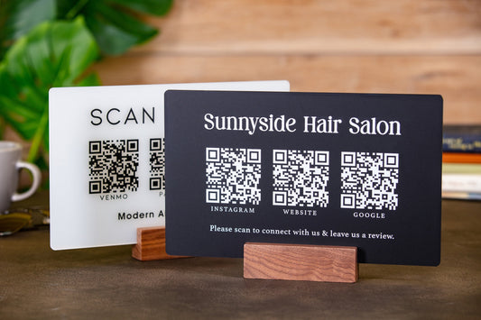 Our custom QR code table signs eliminate the hassle of sharing links, payment details, or social media handles with one quick scan. Essential QR display signs for restaurants, salons, bars, craft shows, pop-up vendors.