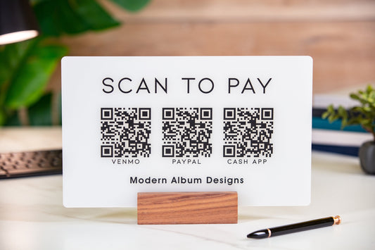 3 QR Codes Scan to Pay w/ Wood Stand - 11.5x7" Scannable Acrylic Desk Signs, Instagram Venmo Website Business Restaurant Bar Reviews Tips