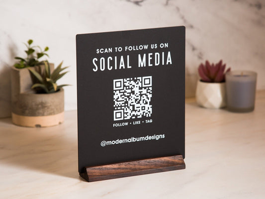 QR Code Social Media Sign w/ Wood Stand - Scannable Office Table Desk Signage, Social Media for Small Business, Salon Restaurant Bar Signs