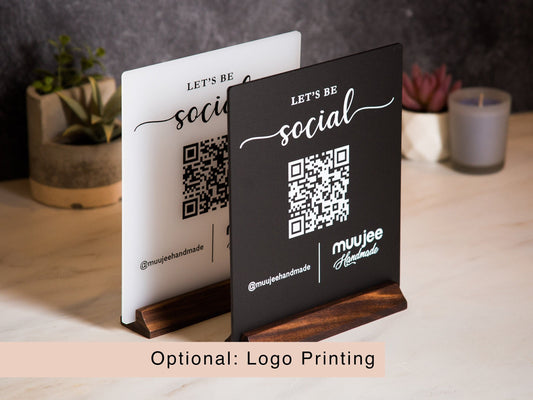 QR Code Social Media Sign w/ Wood Stand - 6.5 x 7.75" Logo Optional Scannable Acrylic Instagram Website Sign for Business Salon Restaurant