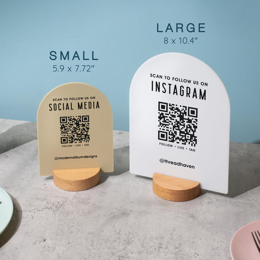 Arched QR Code Social Media Sign - 6x7.75" Scannable Table Desk Signage, Social Media for Small Business, Custom Salon Restaurant Bar Signs