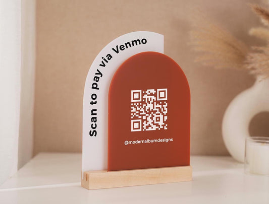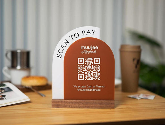 Full Arch Double Acrylic Sign w/ Maple Base (QR Code D1) - Scannable Scan to Pay Signage, Business Website Social Media Venmo Craft Shows