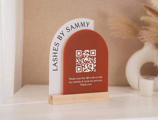 Full Arch Double Acrylic Sign w/ Maple Base (QR Code D2) - Scannable Scan to Pay Signage, Business Website Social Media Venmo Craft Shows