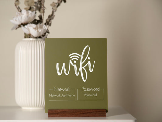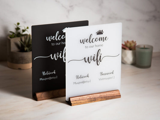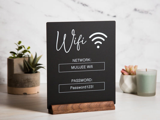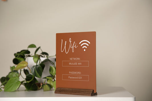 Wifi Password Acrylic Sign w/ Wood Base - 6.5 x 7.75" Standing Table Sign for Home & Airbnb Rental, Small Business Sign