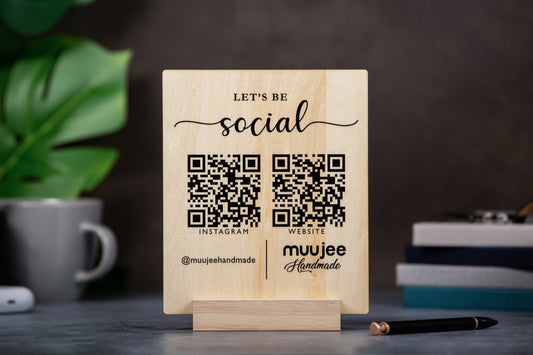 Maple QR Code Social Media Sign w/ Maple Wood Stand - Business Logo Plaque for Pop Up Vendors Weddings Salon Spa Trade Shows Craft Shows