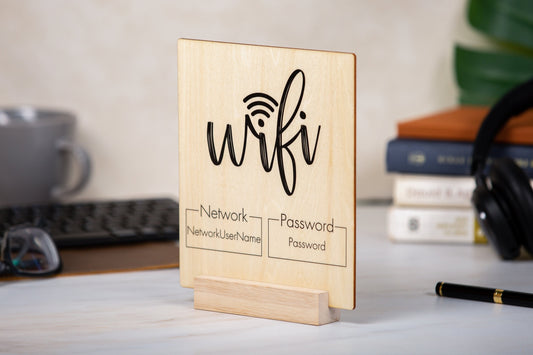Wood Wifi Sign w/ Maple Wood Stand (Design 1) - Freestanding Tabletop Sign Guestroom Essential AirBnB Cabin Rental Cafe Bar Spa Waiting Area