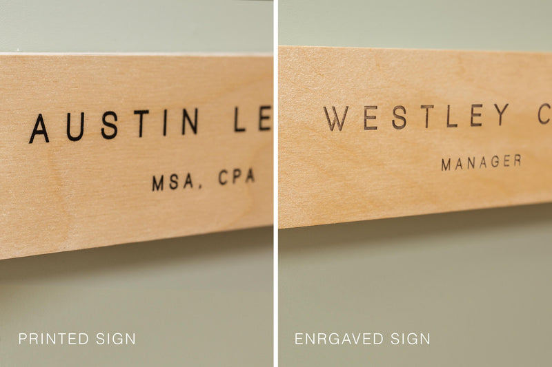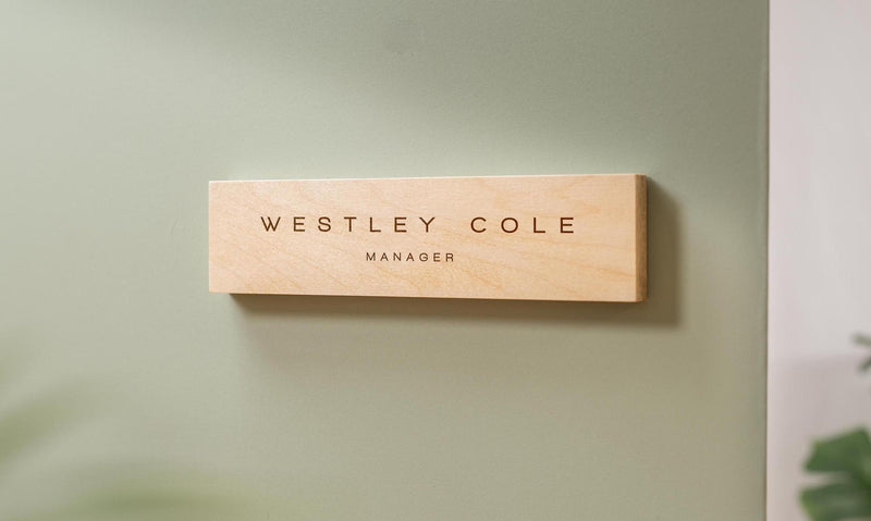 Our sleek plywood name plate adds warm character to your space without losing the sharpness of your brand.